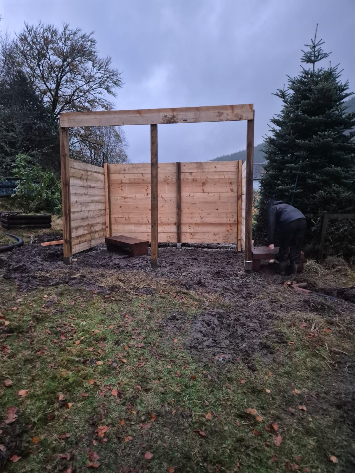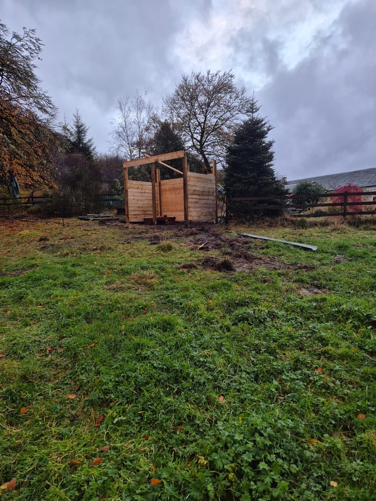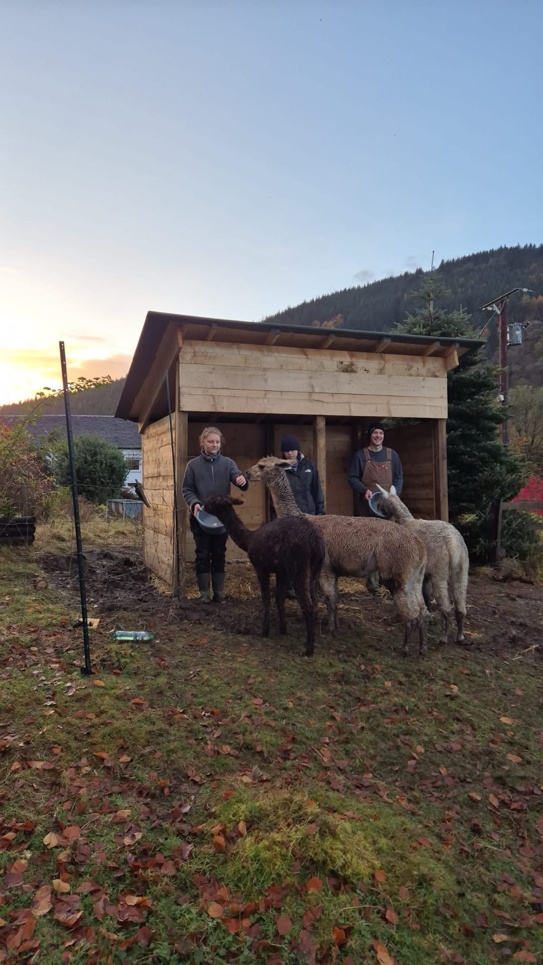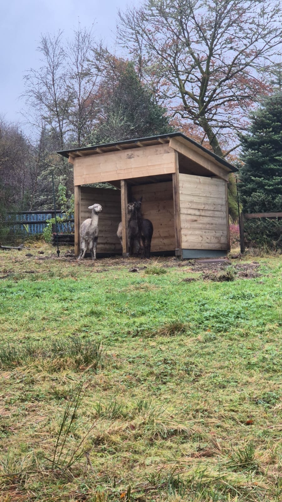 As the weather worsened and the alpacas continued to reject their field shelter, we decided to build a new open-fronted shed facing away from the prevailing wind. It was constructed from repurposed scaffolding wood and surrounded by a French drain rather than a hard floor, which has worked out surprisingly well.