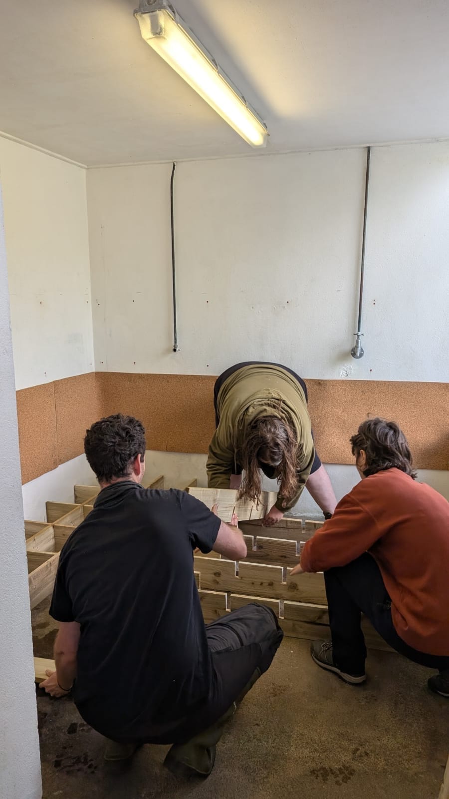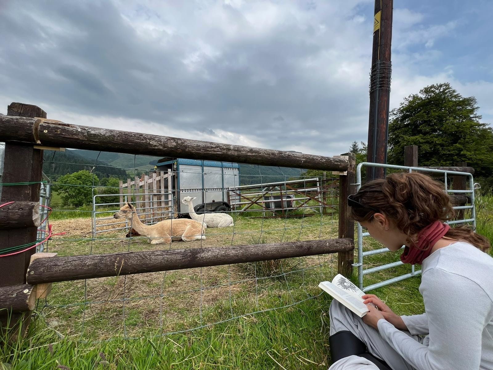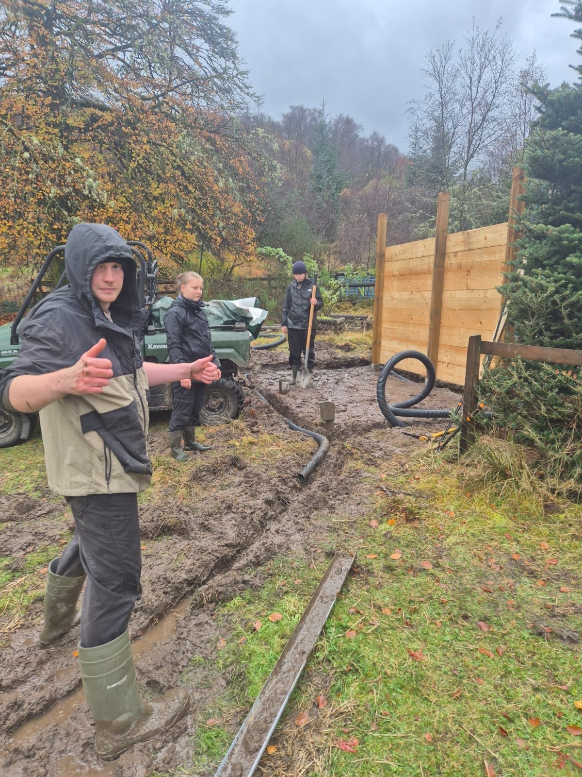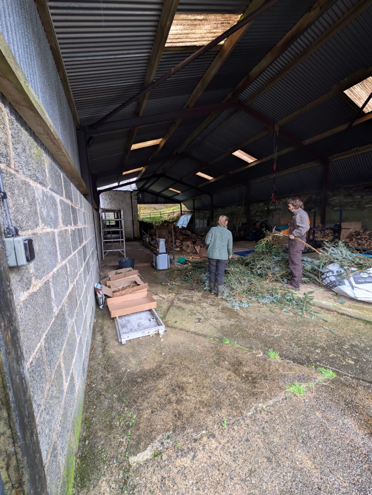 As the weather worsened and the alpacas continued to reject their field shelter, we decided to build a new open-fronted shed facing away from the prevailing wind. It was constructed from repurposed scaffolding wood and surrounded by a French drain rather than a hard floor, which has worked out surprisingly well.