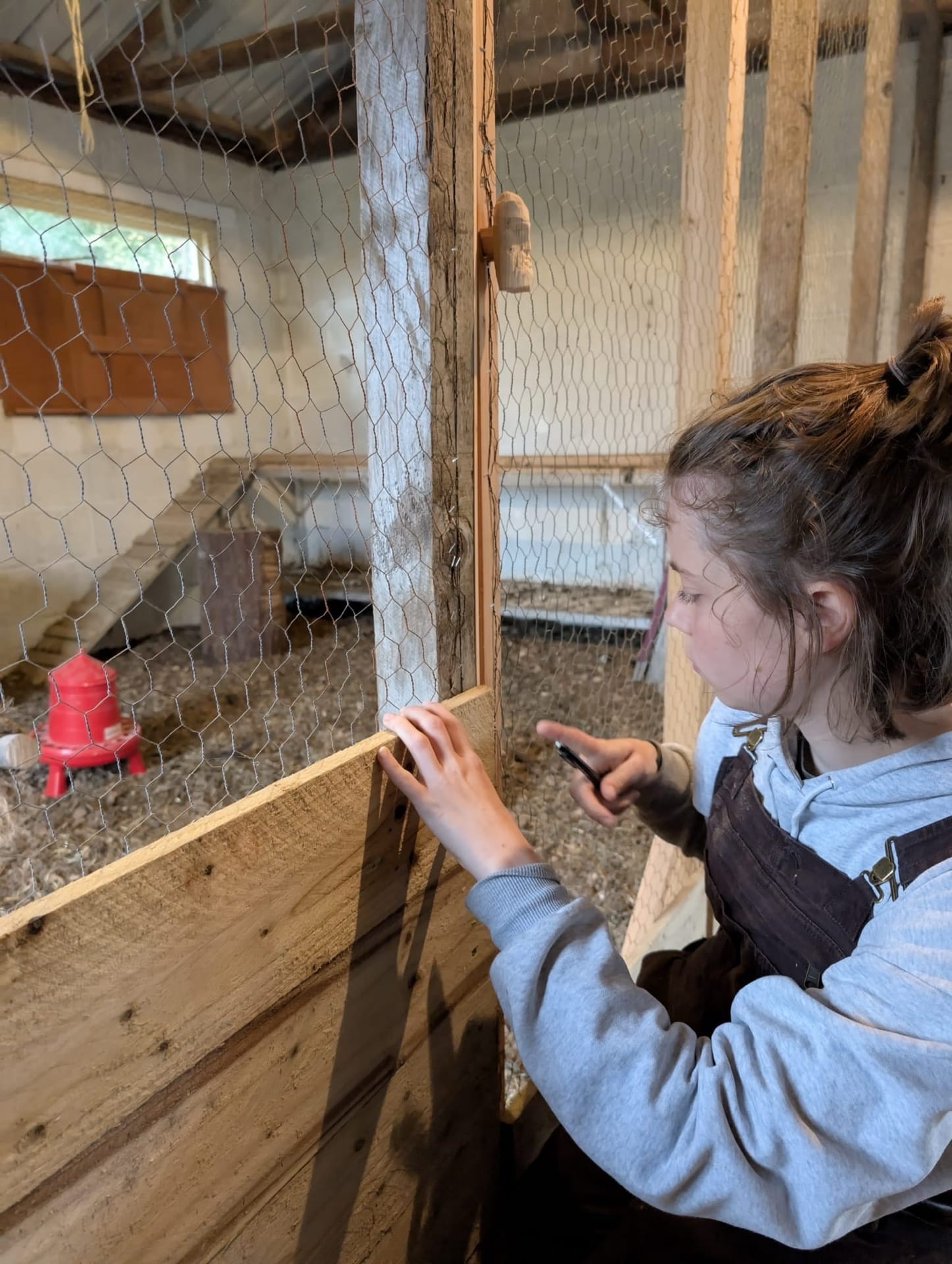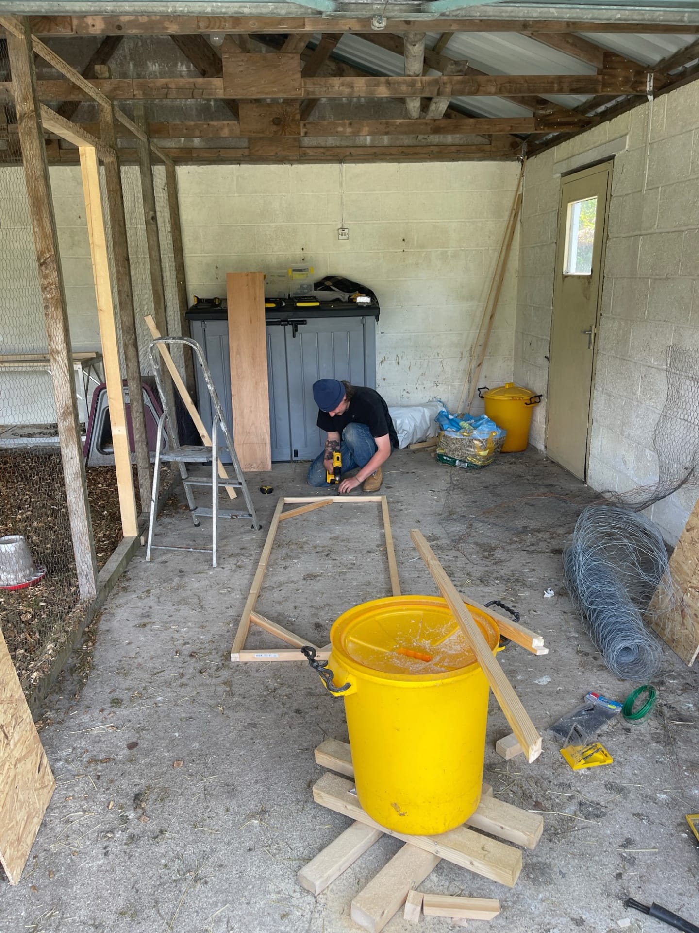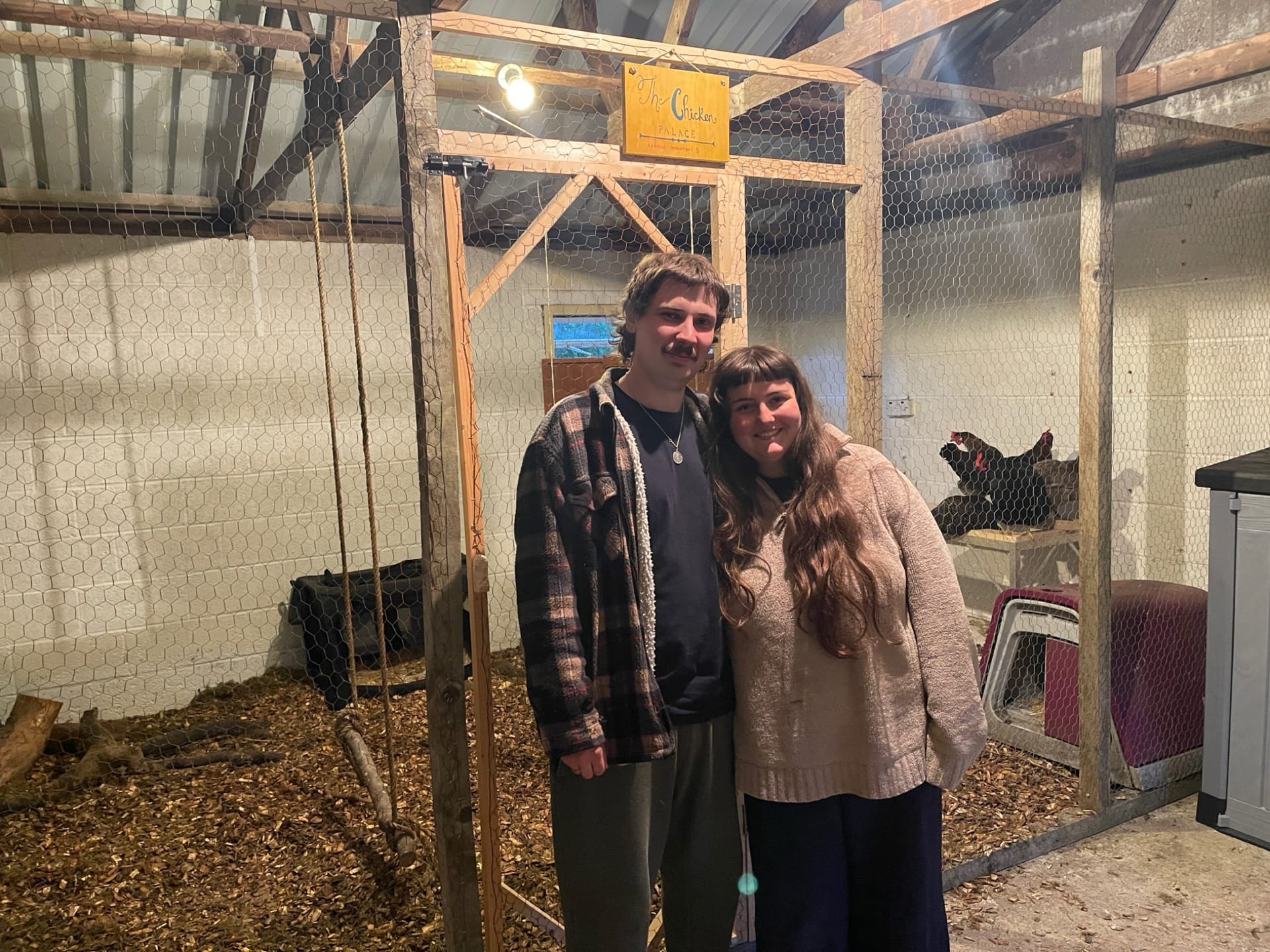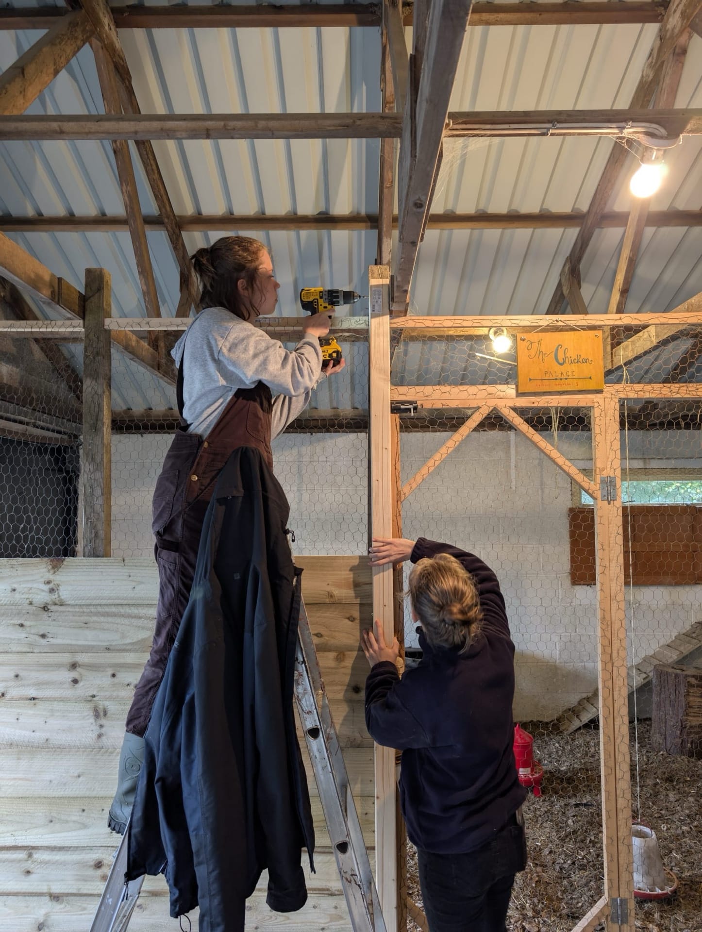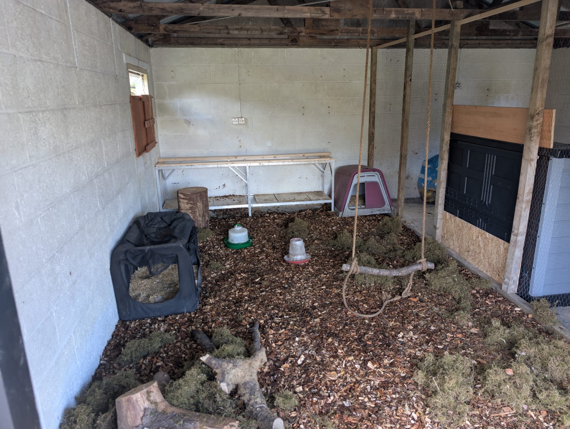 The main project Rowena and Dylan tackled was turning the garage into a proper home for the chickens. Using leftover wood and chicken wire, we put up a partition and installed a door along the middle line of the garage. We filled the chicken area with woodchips and furnished it with tree trunks and a chicken swing made from rope we found in one of the barns.