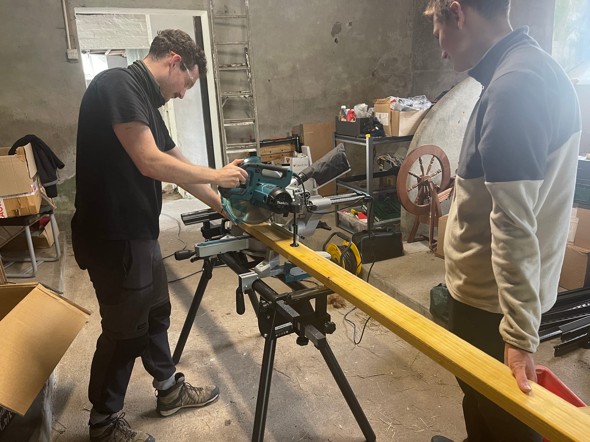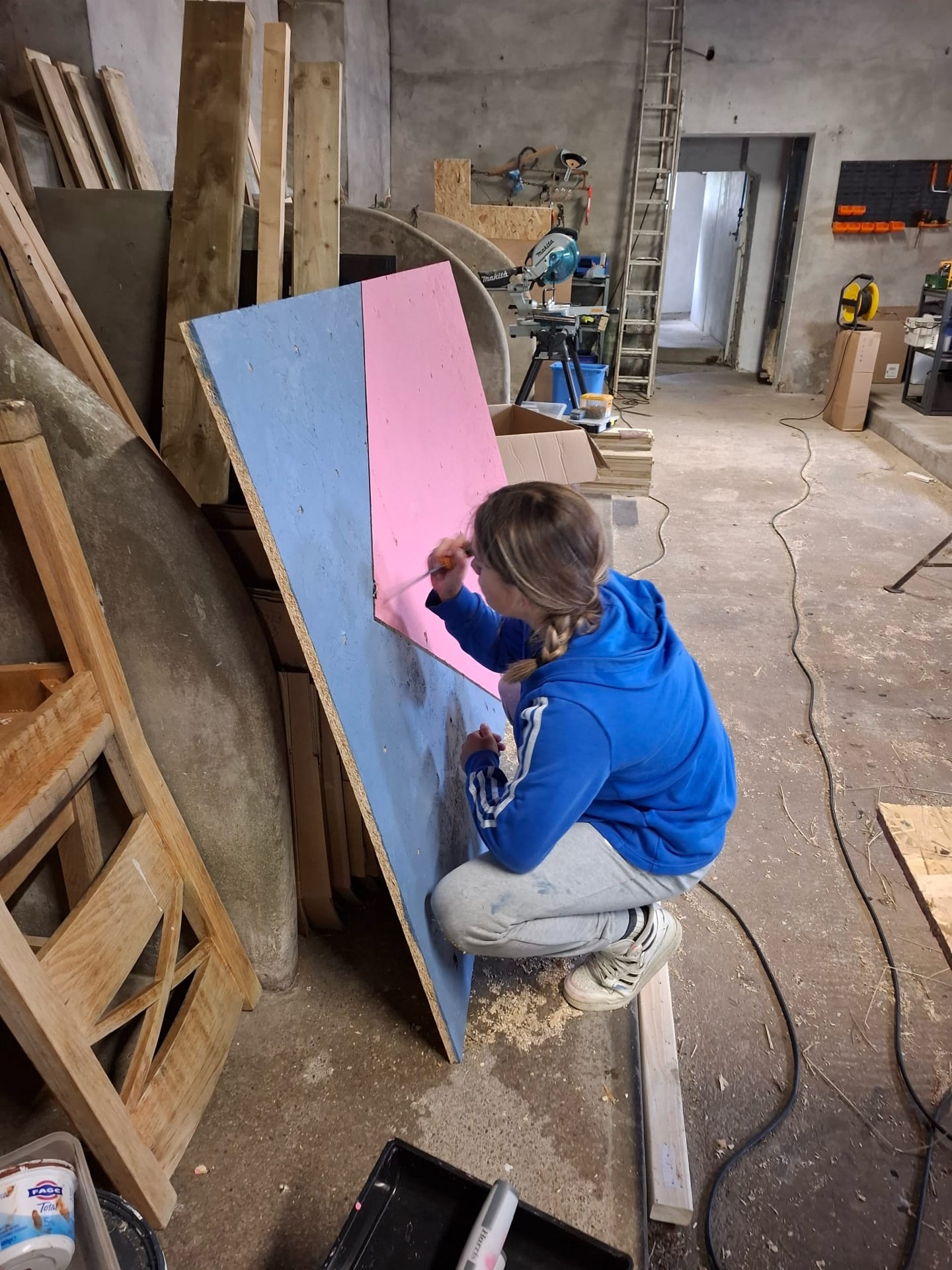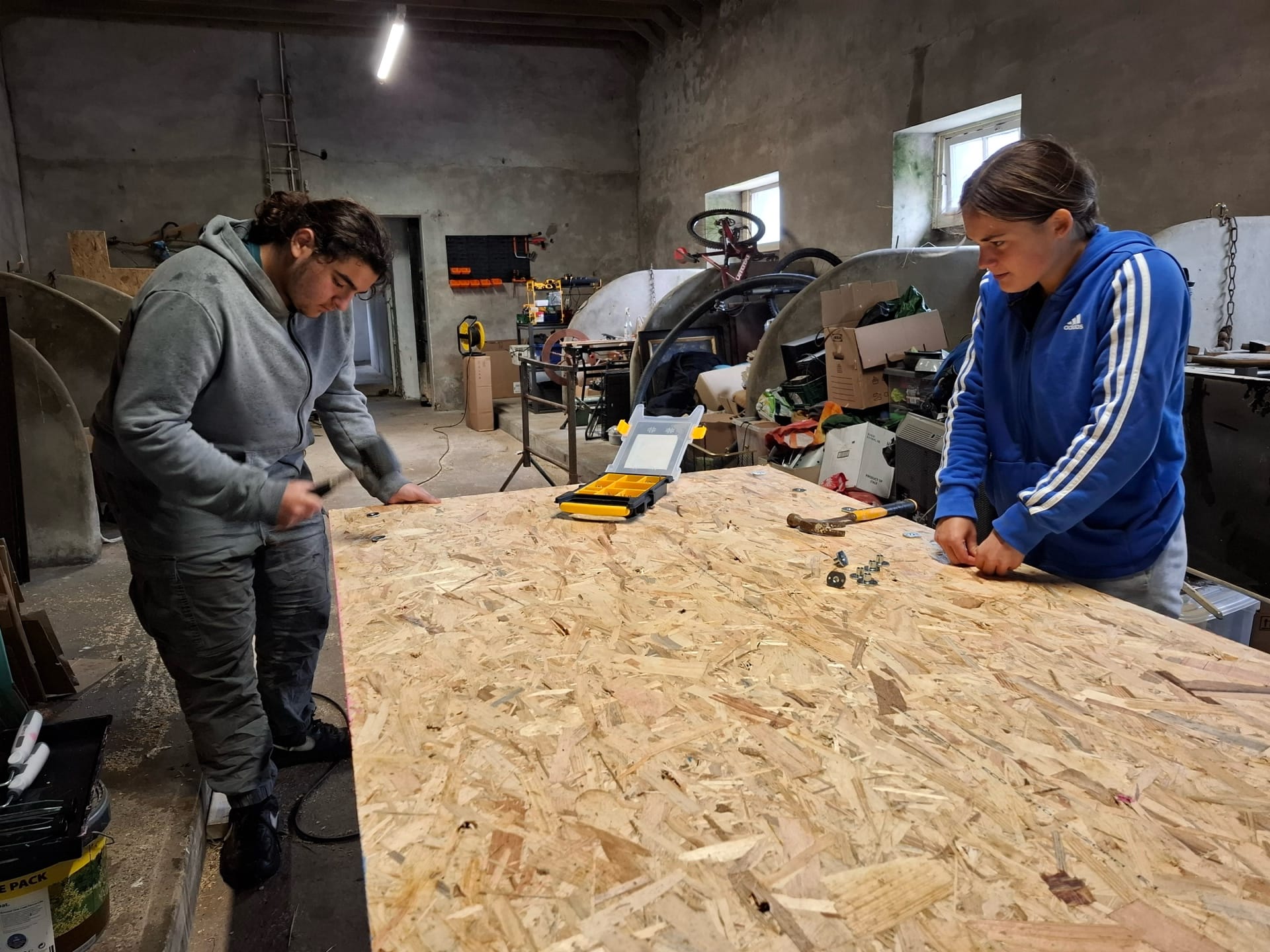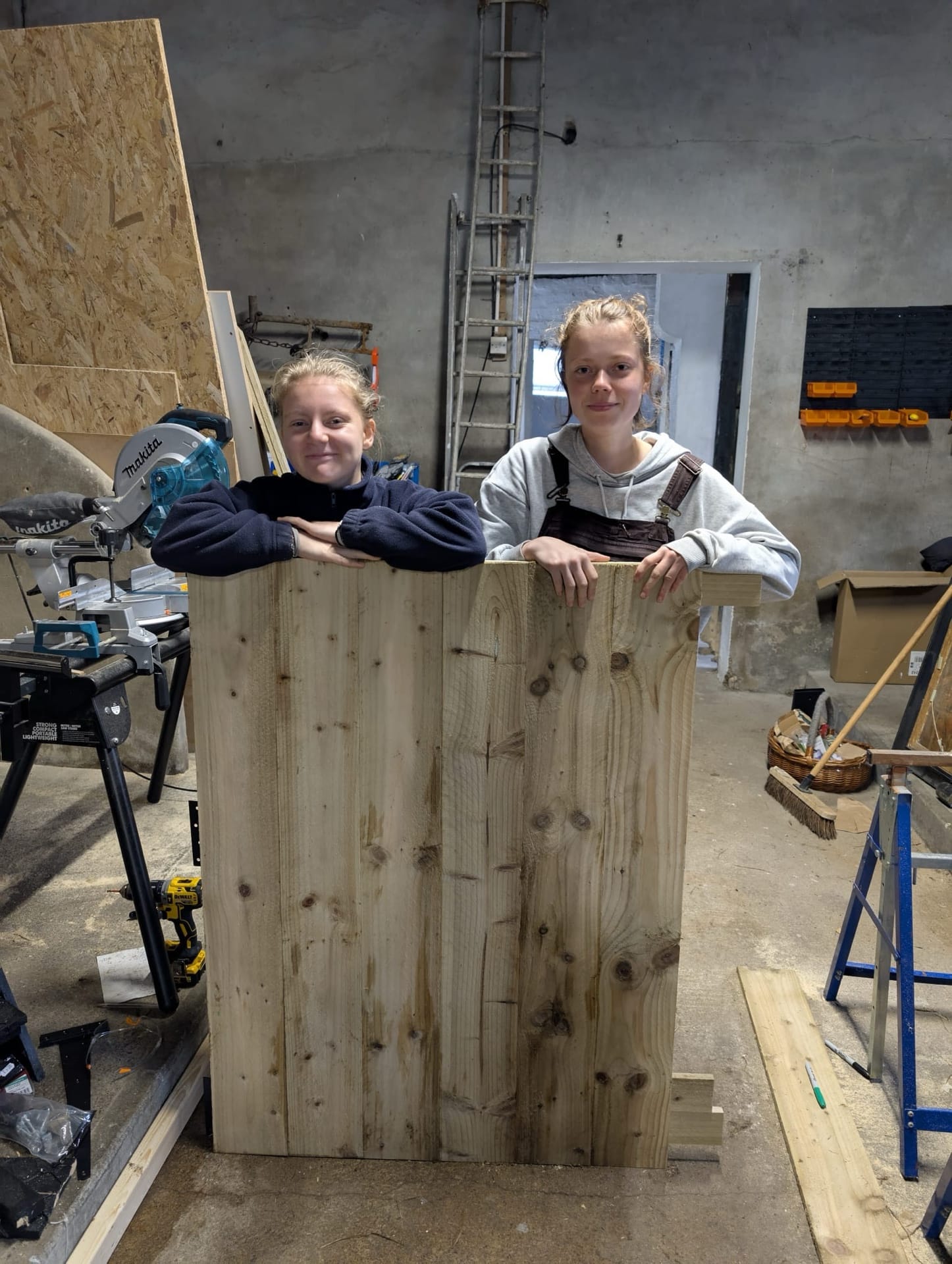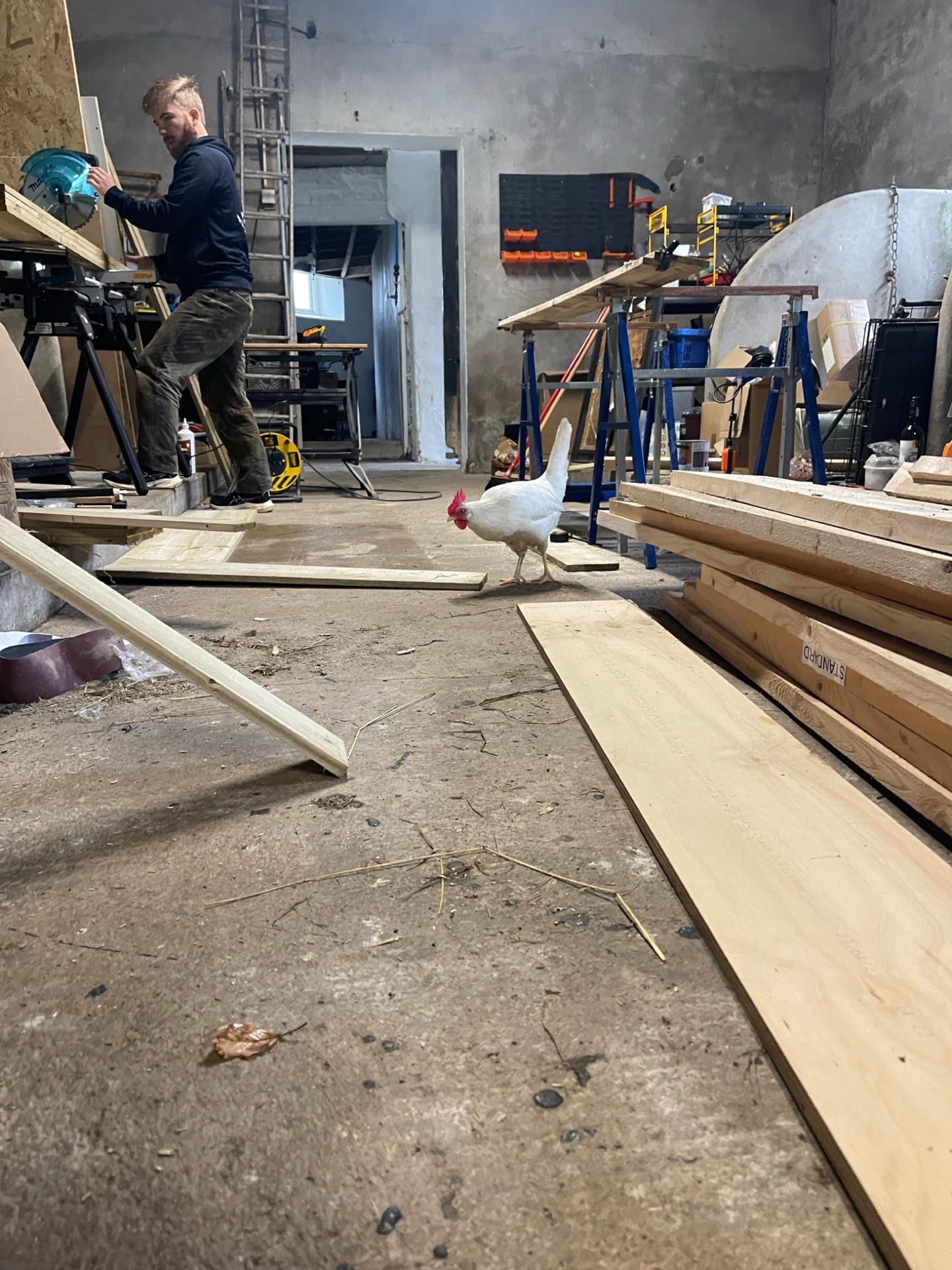The main project Rowena and Dylan tackled was turning the garage into a proper home for the chickens. Using leftover wood and chicken wire, we put up a partition and installed a door along the middle line of the garage. We filled the chicken area with woodchips and furnished it with tree trunks and a chicken swing made from rope we found in one of the barns.