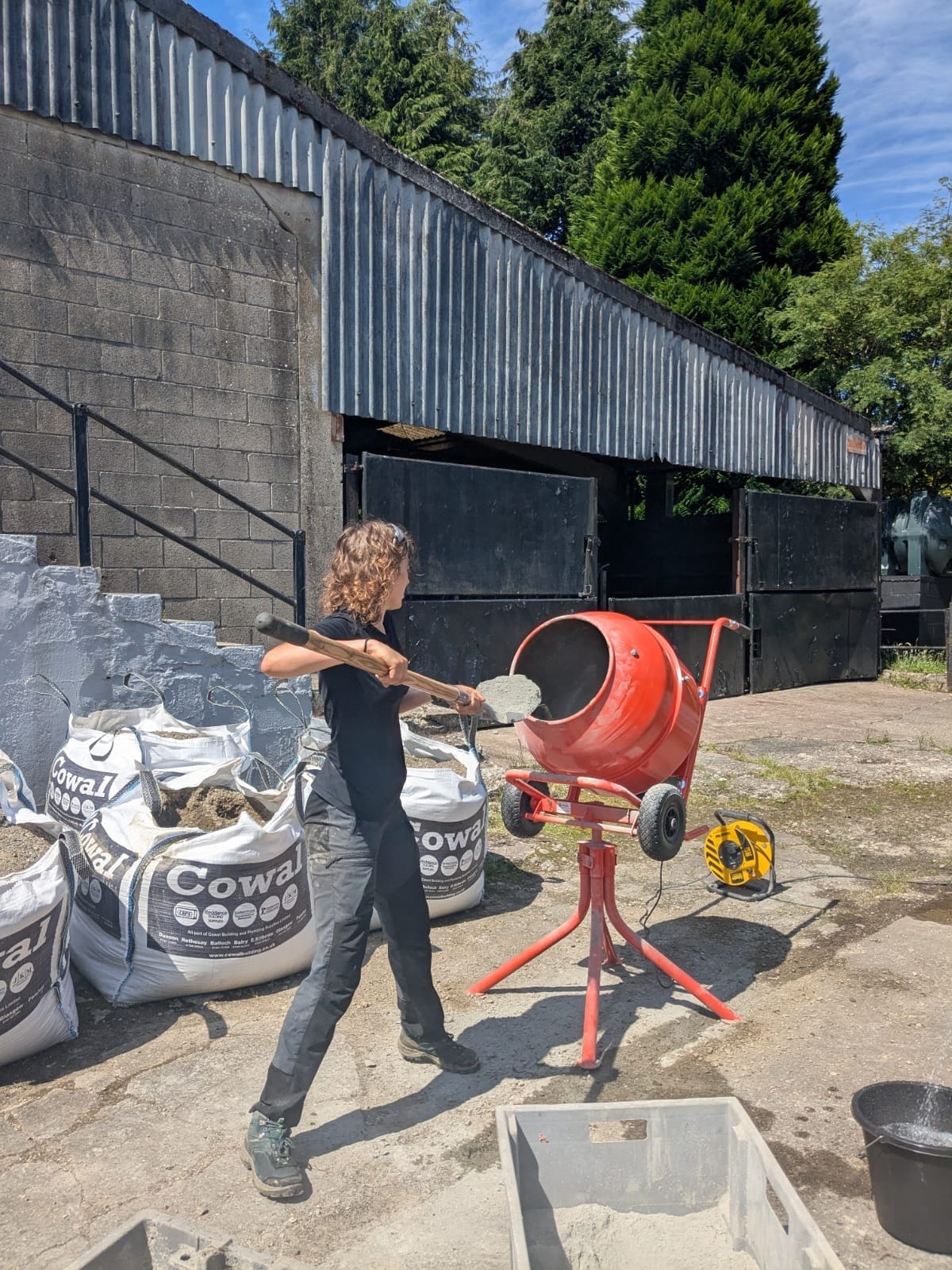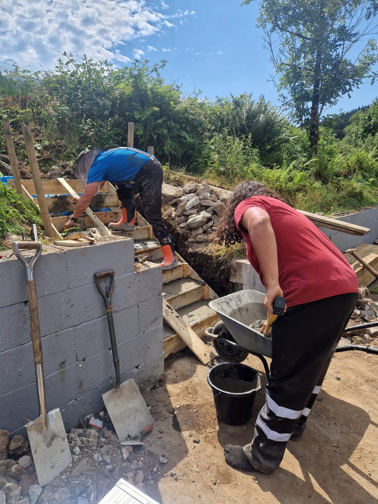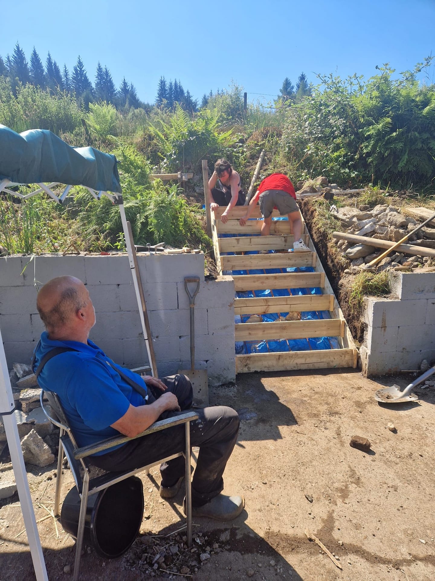 The prestige project in July was breaking through a wall and building steps to connect the courtyard with the upper field. Fortunately, the weather was dry and hot enough for concrete work, although on the flip side it was so hot that work had to start early in the morning.