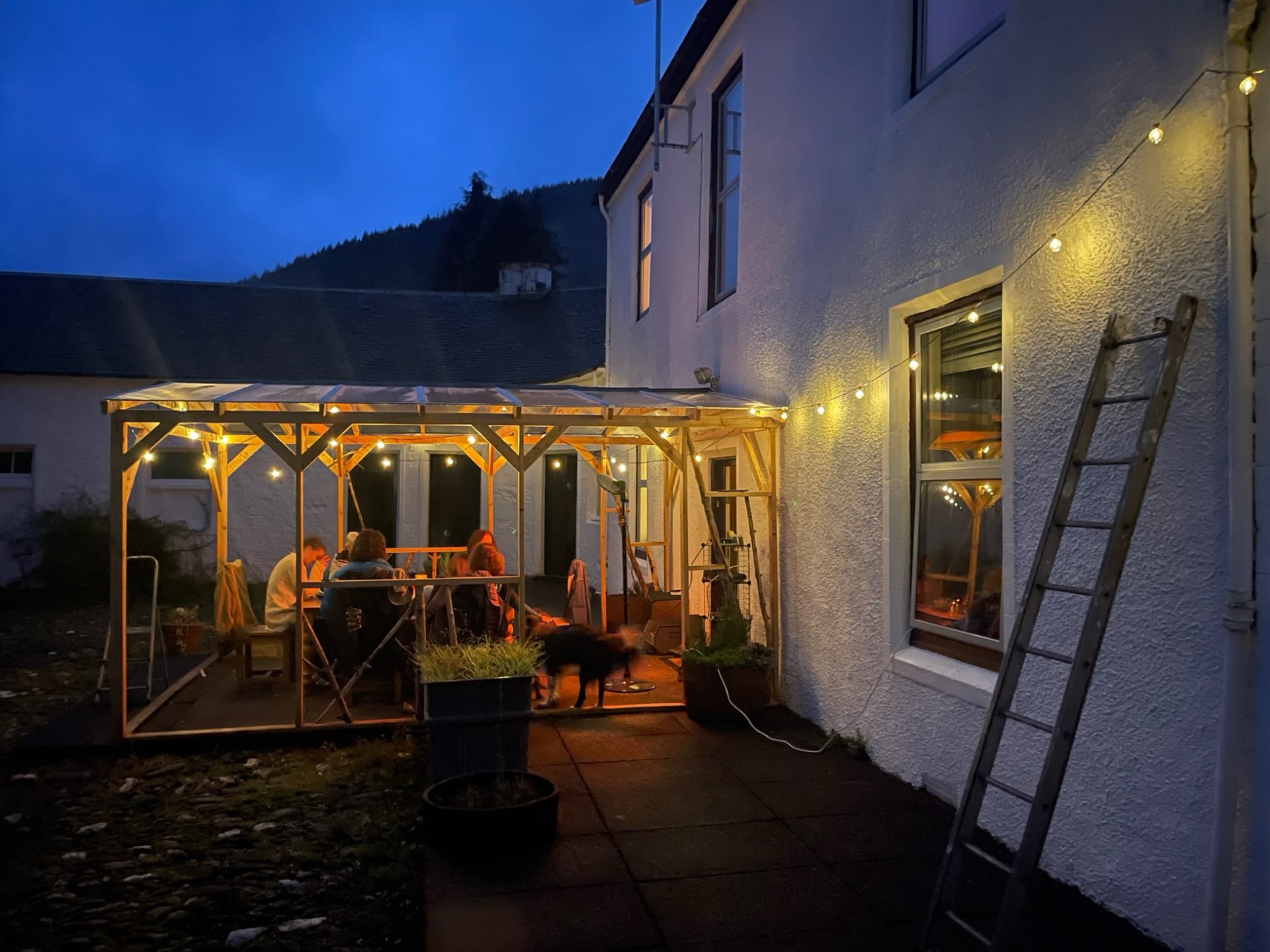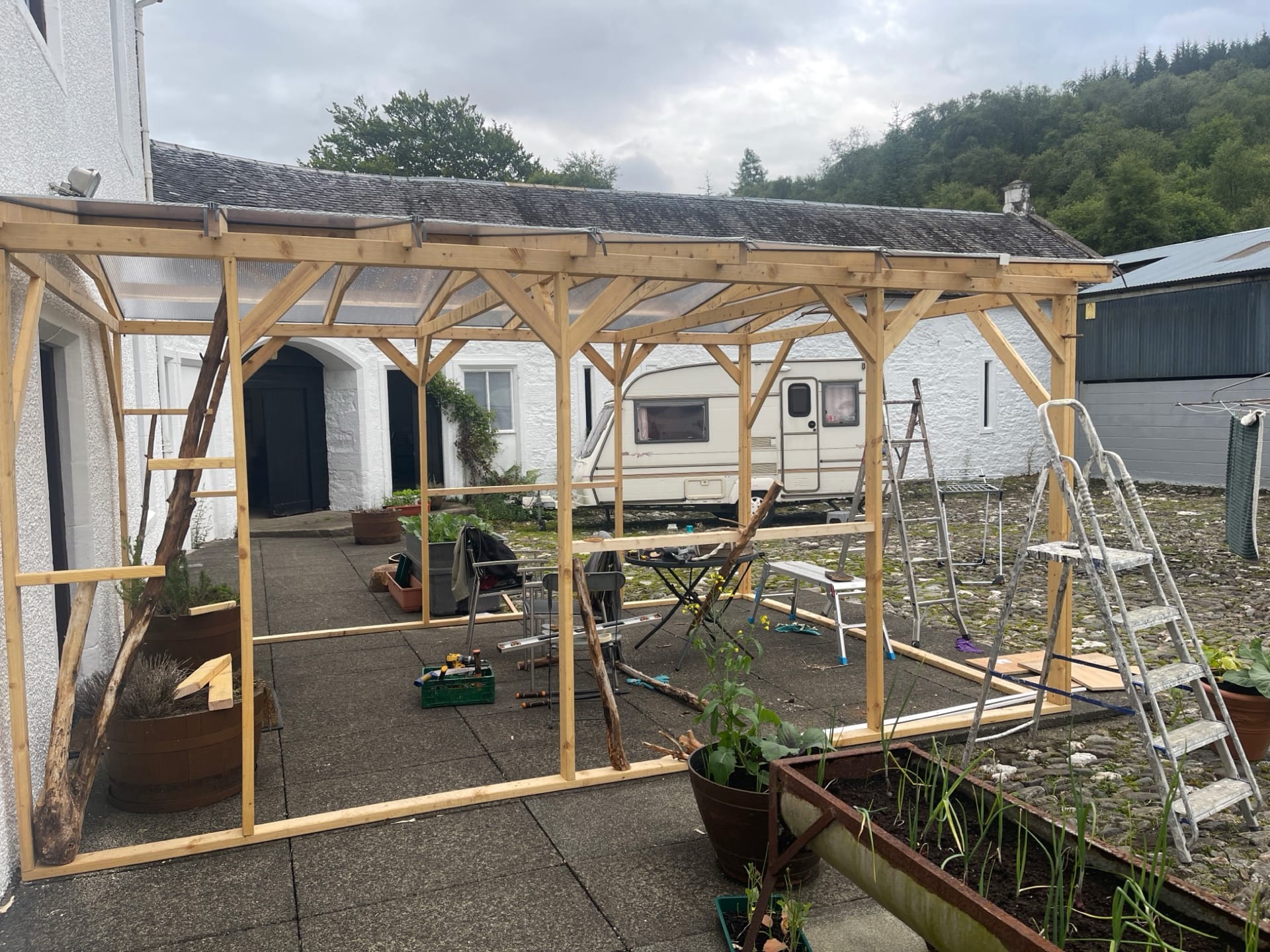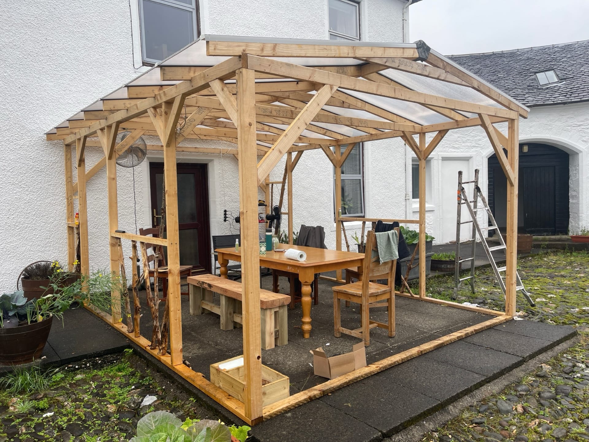 We were lacking a protected outdoor space, so we built a porch area in the courtyard. As our numbers grew, we started using it as an outdoor eating space, although the midges made this a less-than-perfect solution.