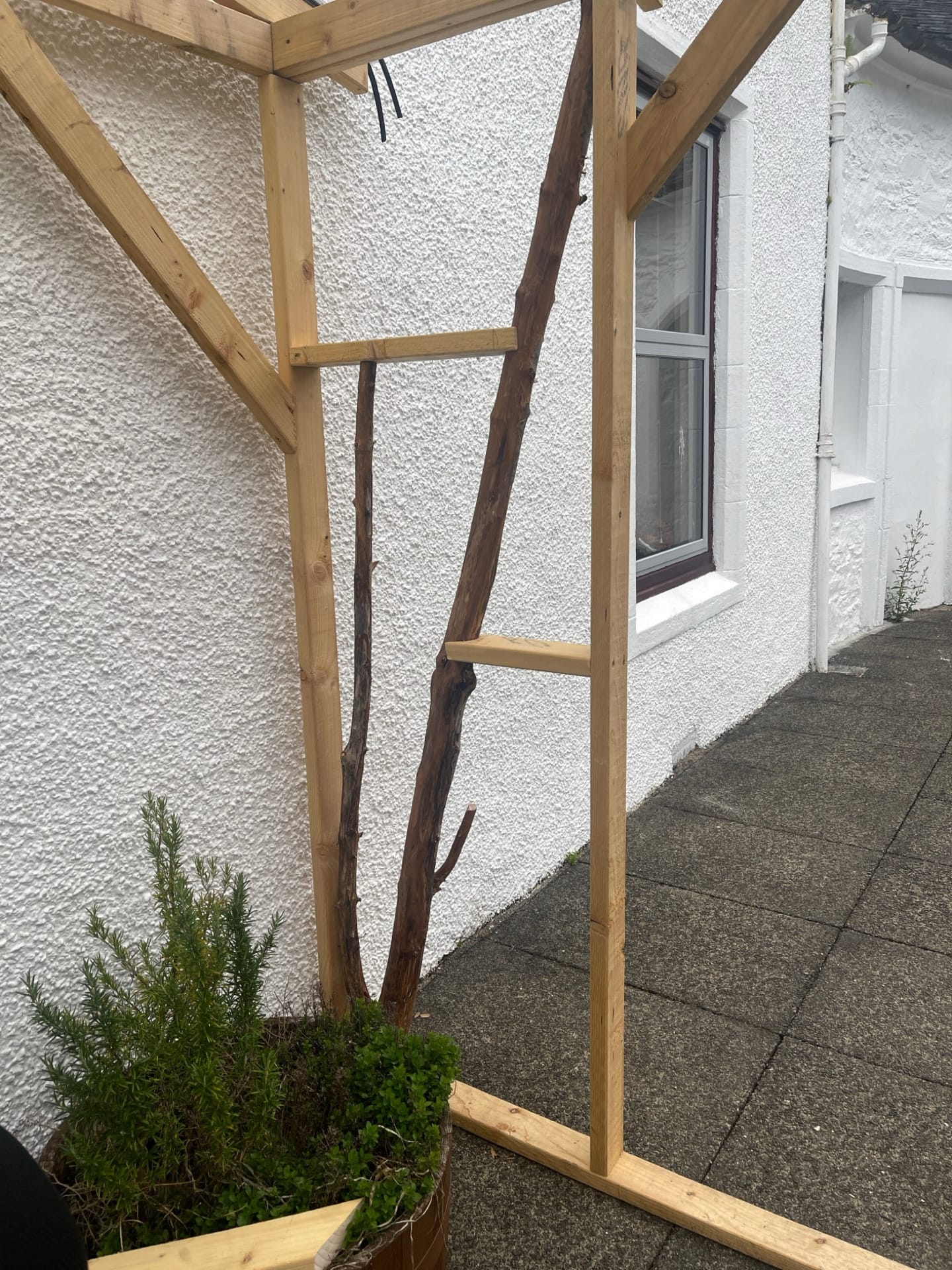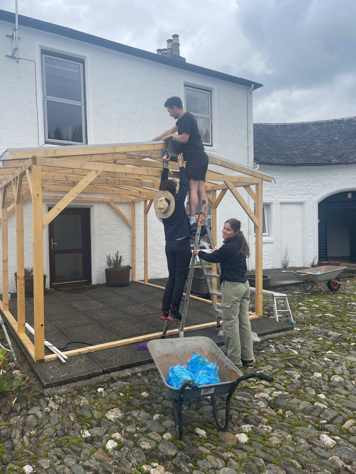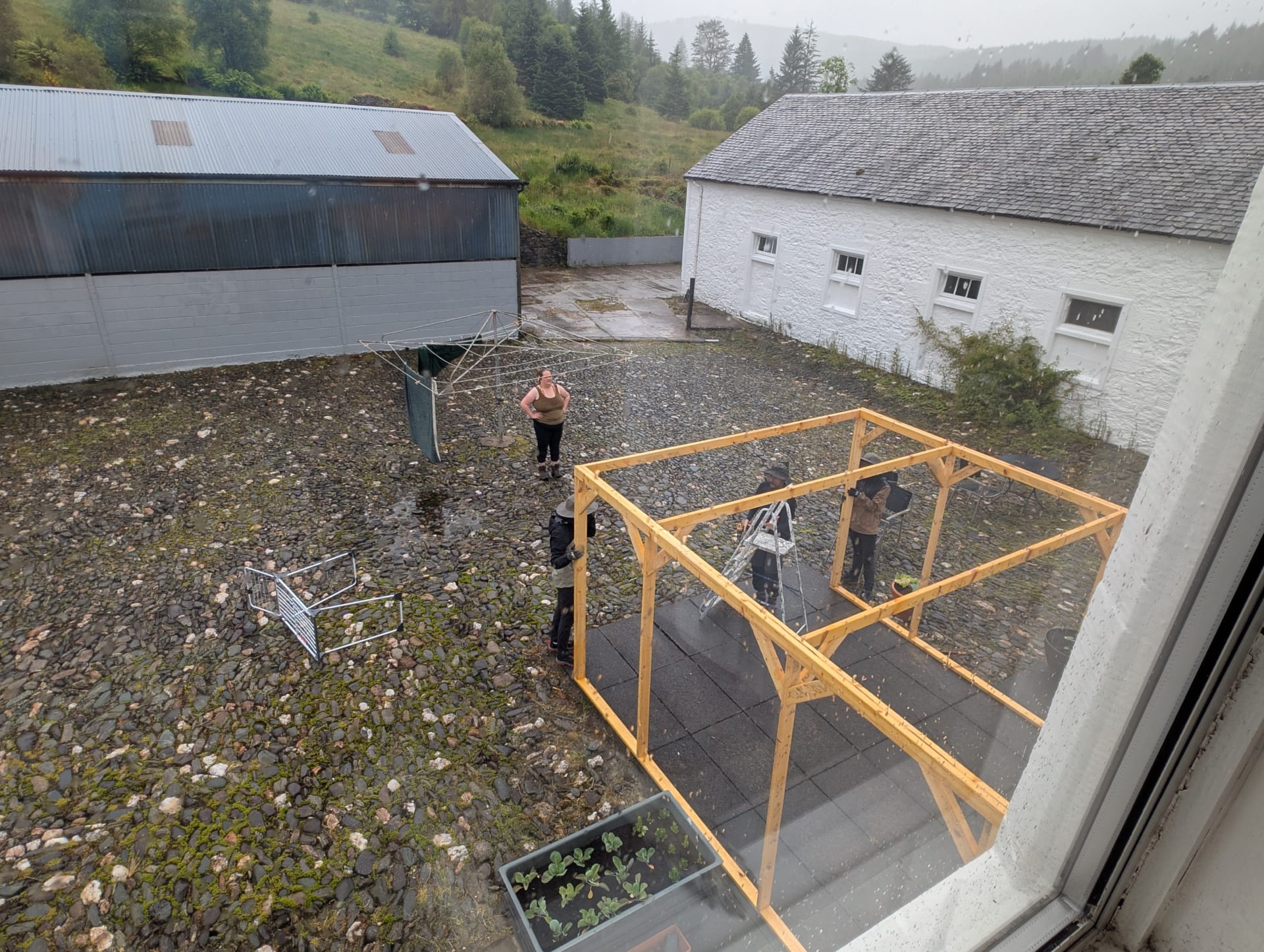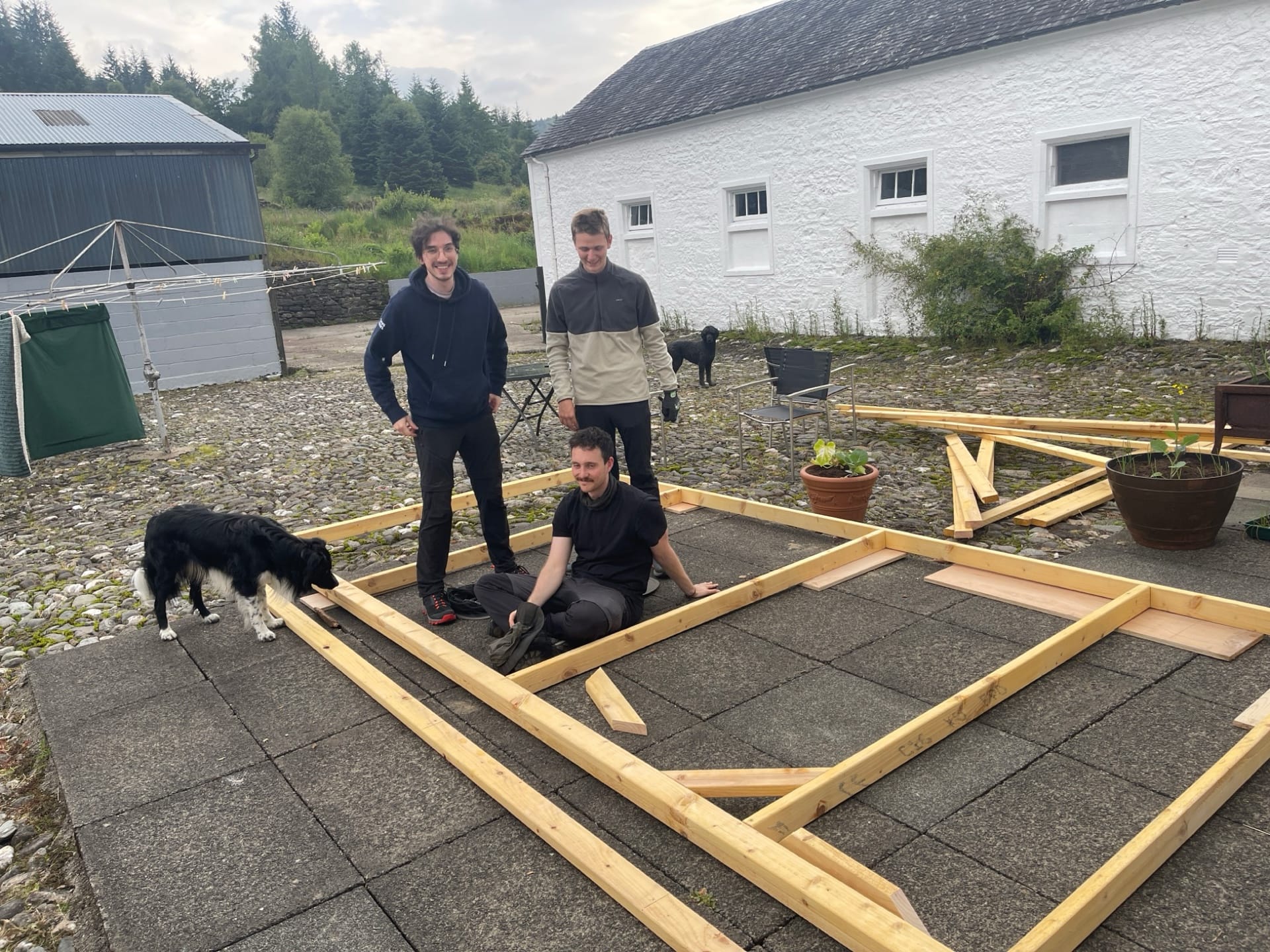We were lacking a protected outdoor space, so we built a porch area in the courtyard. As our numbers grew, we started using it as an outdoor eating space, although the midges made this a less-than-perfect solution.