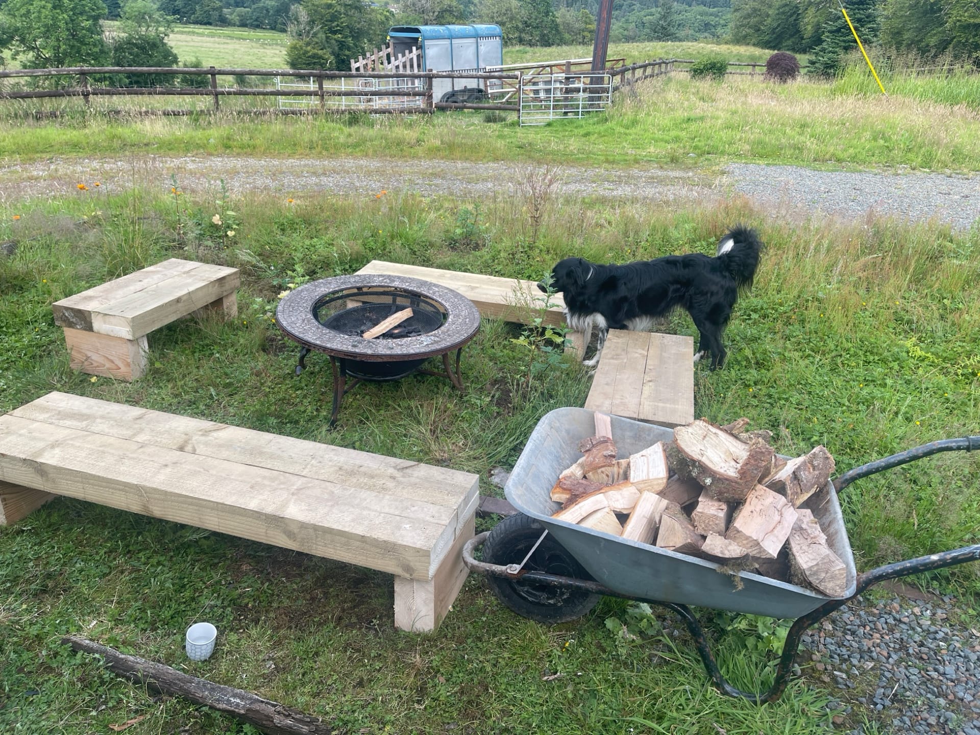 We built four benches for the fire pit area from sleepers. We also found one of the original beams from the farm, likely removed during Forestry Commission alterations, and turned it into the sturdiest bench on the property for the outside dining area.