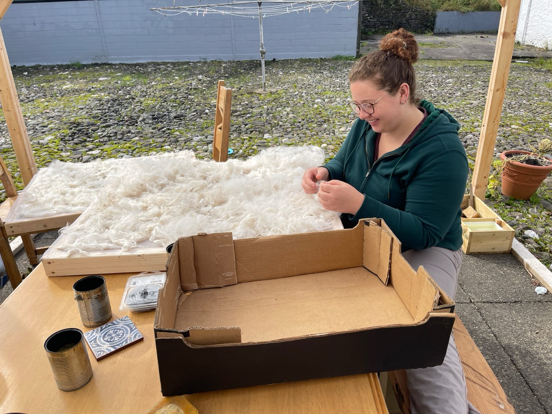 An ankle slip meant we were looking for seated activities. We began the labour-intensive process of washing, teasing and sorting the alpaca wool from the earlier shearing.