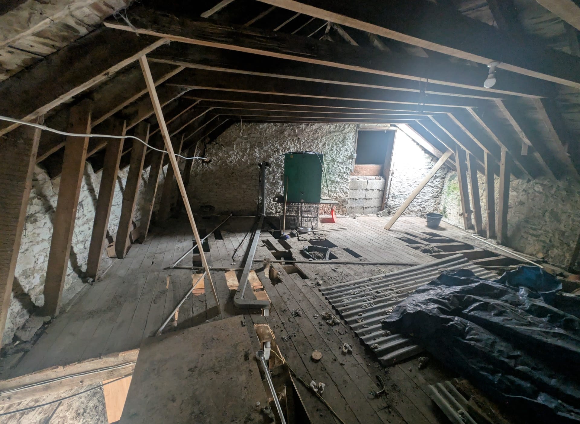 Not a glamorous job by any means, but clearing out the attic above the East Wing barn was an important step in assessing the building’s condition and getting this area ready for development. We found decades-old milk crates, the original windows, something that looked like a Dorian Gray mirror, and a lot of unidentifiable rubble.