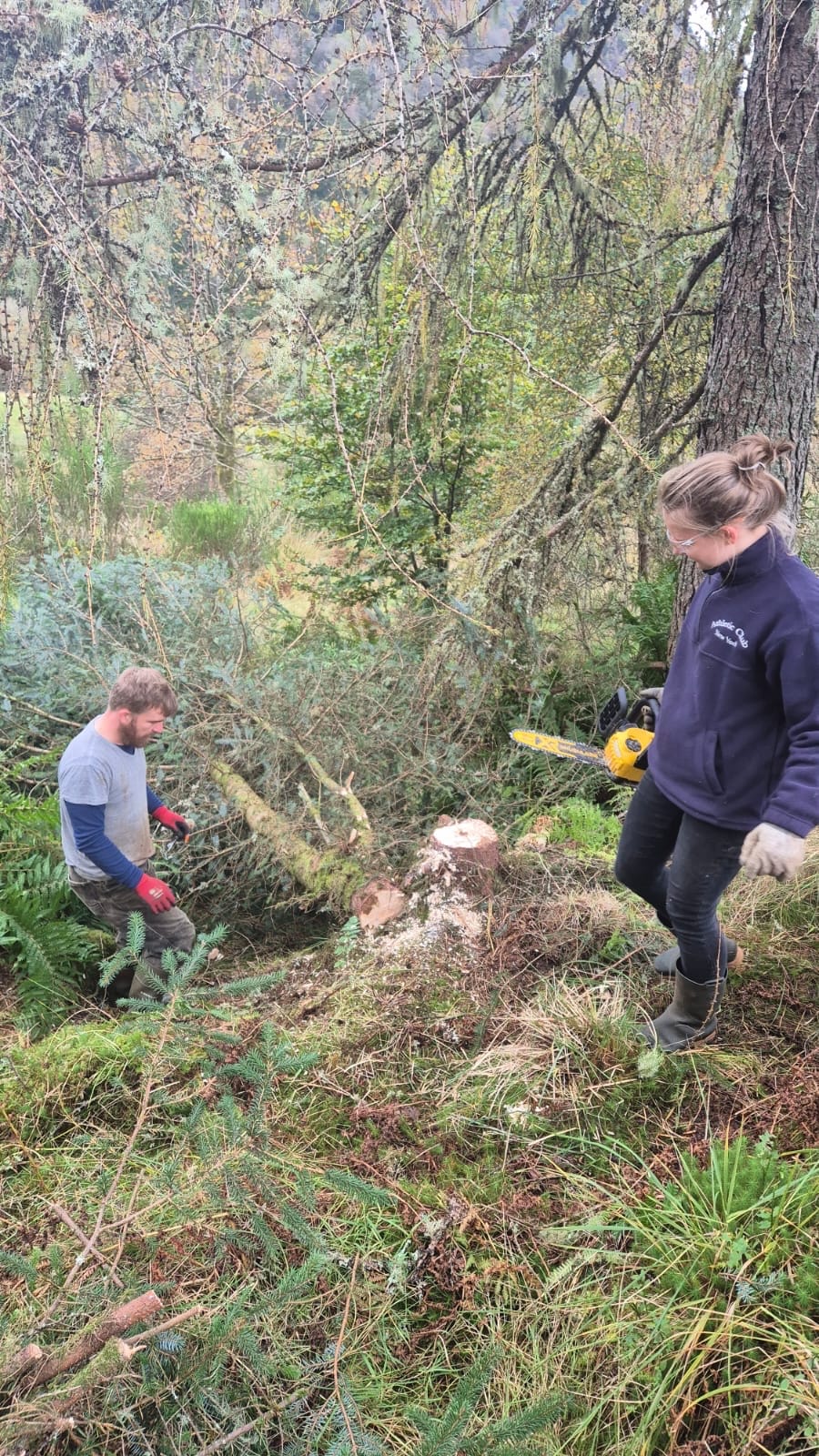 As part of early rewilding efforts, two invasive trees were felled and processed into logs and woodchips. Some of the spruce branches were layered along the upper field paths to help establish them.
